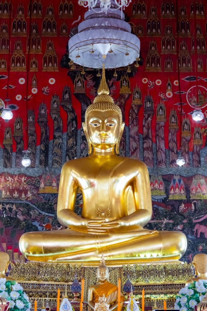 พระพุทธเทวปฏิมากรเป็นพระพุทธรูปปางสมาธิ ซึ่งสื่อความหมายว่ารัชกาลที่ 1 ประสงค์ตั้งมั่นแน่วแน่ในคราวการสร้างพระนครว่านี่จะเป็นพระนครอย่างถาวร (ปางสมาธิ สื่อถึงการตั้งจิตมั่นแน่วแน่) ลักษณะพระพุทธรูปปางสมาธิ นั่งขัดสมาธิราบ หล่อด้วยสำริด ลงรักปิดทอง หน้าจักกว้าง 1.3 เมตร สูง 16.5 เมตร ศิลปะอยุธยา พระพักตร์ค่อนข้างเคร่งขรึม ขมวดพระเกษาเล็ก รัสมีเป็นเปลวสูง ฐานชุกชีได้รับการบูรณะใหม่ในสมัยรัชกาลที่ 3 โดยได้ทำการยกฐานขึ้นสูงเป็นฐาน 3 ชั้น ชั้นล่างสุดมีพระสาวกล้อมรอบ 8 องค์ ชั้นที่ 2 มีพระสาวก 2 องค์ รอบฐานประดับ ยักษ์ ครุฑ เทวดา ล้อมรอบตามแต่ละชั้น และได้มีการอัญเชิญพระสรีรางคารของรัชกาลที่ 1 มาประดิษฐานไว้ที่ฐานชุกชีใต้องค์พระพุทธรูป และประดิษฐานพระราชลัญจกรของพระองค์ คือ อุณาโลม ไว้ที่กลางผ้าทิพย์ และถวายฉัตร 9 ชั้น กางเหนือพระพุทธเทวปฏิมากร ทำให้พระพุทธเทวปฏิมากรตั้งอยู่สูงมากกว่าพระประธานในพระอุโบสถทั่วไป ซึ่งอาจจะมาจากการสร้างให้สมกับสัดส่วนพระอุโบสถที่ขยายใหญ่ขึ้น